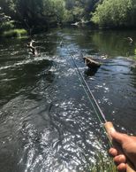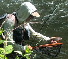 My fishing started off kind of slowly. I didn't even get a bump until the third hole I fished. That is pretty unusual for me at my special spot. I was just starting to wonder what to try when I heard a loud crashing across the river. I initially thought it was a deer but was surprised when a man, fully outfitted in fly regalla stepped through the bushes and into the water. He didn't see me at first and started to fish. After a few casts, he looked up and noticed I was across from him on the river. We exchanged pleasantries and information about our days. I caught a few fish and then moved downstream. I set up at a nice hole and the fish just started coming. Just as I was landing fish after fish, my co-fisherman set up across from me. We ended up talking and fishing for quite a while. I learned a few things about my fellow fisherman.