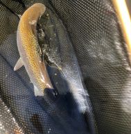I went back to fish the following Wednesday. This day was mellow from the start. Fish were caught and I felt super mellow. I went from spot to spot, fishing and having fun. I came upon the last pool and told myself that one more fish and I would hit the road for home. It had been a productive and relaxing day. I dropped my fly in and managed the drift on my tightline setup. The line pulled tight and the fish took more off the reel. It took me a little while to get the fish in and I could tell he was sizeable. Imagine my surprise when I got him in my net and saw a unique scar over his right eye- It was my buddy from Sunday. Same size. Same scar. I couldn't believe my eyes.